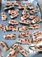 Fill the halved jalapenos with the cream cheese mixture and top with the crumbled bacon bits and bread crumbs.